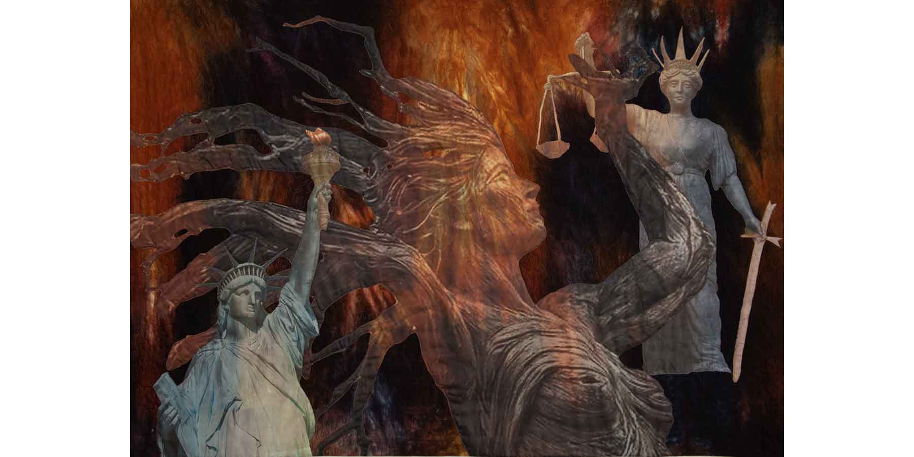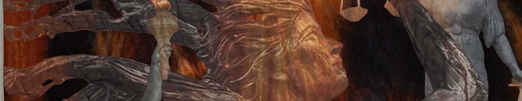 This is the third quilt in The World’s On Fire series exploring my angst over what is at risk for humanity--liberty, justice, and stewardship of the Earth, the planet we all inhabit--due to our current government’s domestic and global political activities.